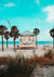 Dieses Gemälde zeigt einen Rettungsturm an einem Sandstrand mit Palmen im Hintergrund.