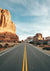 Dieses Gemälde zeigt eine gerade, leere Straße, die sich in der Ferne erstreckt, flankiert von hohen, rötlichen Felsformationen unter einem klaren, blauen Himmel. Kleine Schneestücke sind zwischen den Felsen sichtbar.
