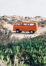 Ein Gemälde von einem orangefarbenen Bus am Strand.