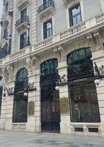 Dieses Gemälde zeigt ein stilvolles Gebäude mit wunderschönem Schmiedeeisen, auf dem das goldene Hermes-Logo glänzt. Es strahlt zeitlose Eleganz aus, perfekt für eine luxuriöse Atmosphäre.