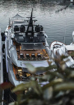 Dieses Gemälde fängt den Luxus einer Yacht mit raffinierten Details ein. Es ruht in einer idyllischen Yachthafen-Umgebung.