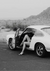 Dieses Gemälde zeigt ein Schwarzweißfoto einer Dame, die in einem Auto sitzt, dessen Tür geöffnet ist. Das Auto steht am Straßenrand geparkt, mit einer kargen Landschaft im Hintergrund.