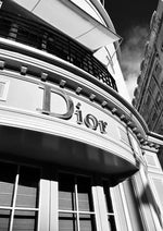 Dieses Gemälde zeigt ein cooles Schwarz-Weiß-Foto eines Geschäfts mit dem stilvollen Dior-Logo. Das Geschäft strahlt eine moderne und schicke Atmosphäre mit großen Fenstern und schicken Details aus.