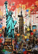 Dieses Gemälde zeigt ein lebendiges Kunstwerk im Graffiti-Stil, das die Freiheitsstatue und das Empire State Building darstellt.