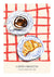 Dieses Gemälde zeigt eine Posterillustration einer Tasse Kaffee und einem Croissant, serviert auf Tellern mit einem blau-weißen Muster, platziert auf einem Tisch mit einem roten Rastermuster. Unten auf dem Poster steht der Text 'Café Cornetto'