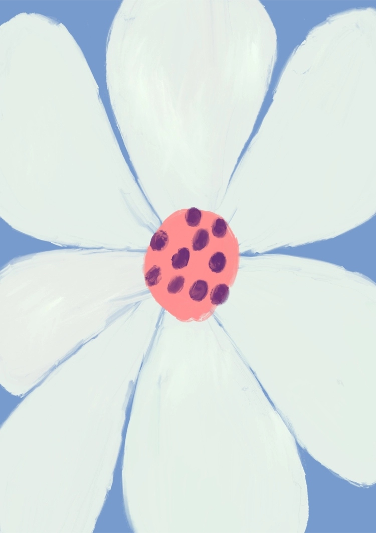 Ein schlichtes Gemälde einer weißen Blume mit sechs Blütenblättern und einem gepunkteten roten Zentrum vor einem hellblauen Hintergrund. Die Pinselstriche sind sichtbar und verleihen dem Bild Textur.