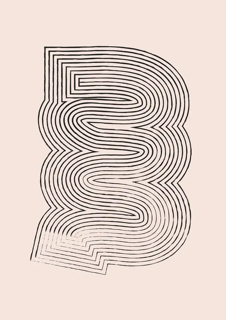 Dieses abstrakte Gemälde zeigt eine schwarze Linienillustration eines verzerrten Buchstabens 'B' mit mehreren konzentrischen Linien, die einen dreidimensionalen Effekt auf einem einfarbigen hellrosa Hintergrund erzeugen, geeignet als Wanddekoration für den Innenbereich.