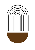 Een minimalistisch ontwerp met een reeks zwarte verticale lijnen die een boog vormen, waarbij de onderste helft is ingebed in een bruine halve cirkel, allemaal tegen een witte achtergrond uit CollageDepot's product 040 - bestsellers.-
