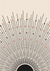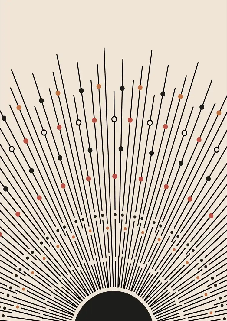 Abstract geometrisches Gemälde mit einem grafischen Muster aus radialen schwarzen Linien, abwechselnd mit orangefarbenen und rosa Punkten, ausgehend von einem zentralen schwarzen Kreis auf beigem Hintergrund.