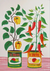 Dieses Gemälde zeigt eine künstlerische Illustration von zwei Pflanzen, die aus Salsa-Dosen wachsen, eine mit gelber Paprika und die andere mit roten Chilischoten.