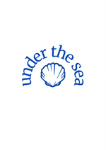 Ein Gemälde mit dem Satz "under the sea" in blauer, gebogener Schrift über einer stilisierten blauen Muschel, zentriert auf weißem Hintergrund.