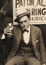 Ein schwarz-weißes Gemälde eines Mannes mit einem Getränk. Dahinter Text an der Wand.