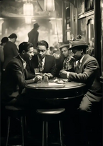 Ein Gemälde mit Männern um einen Tisch in einer Vintage-Bar.