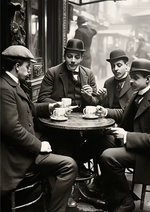 Ein schwarz-weißes Gemälde von Männern um einen Tisch. Zusammen mit einer Tasse Kaffee.