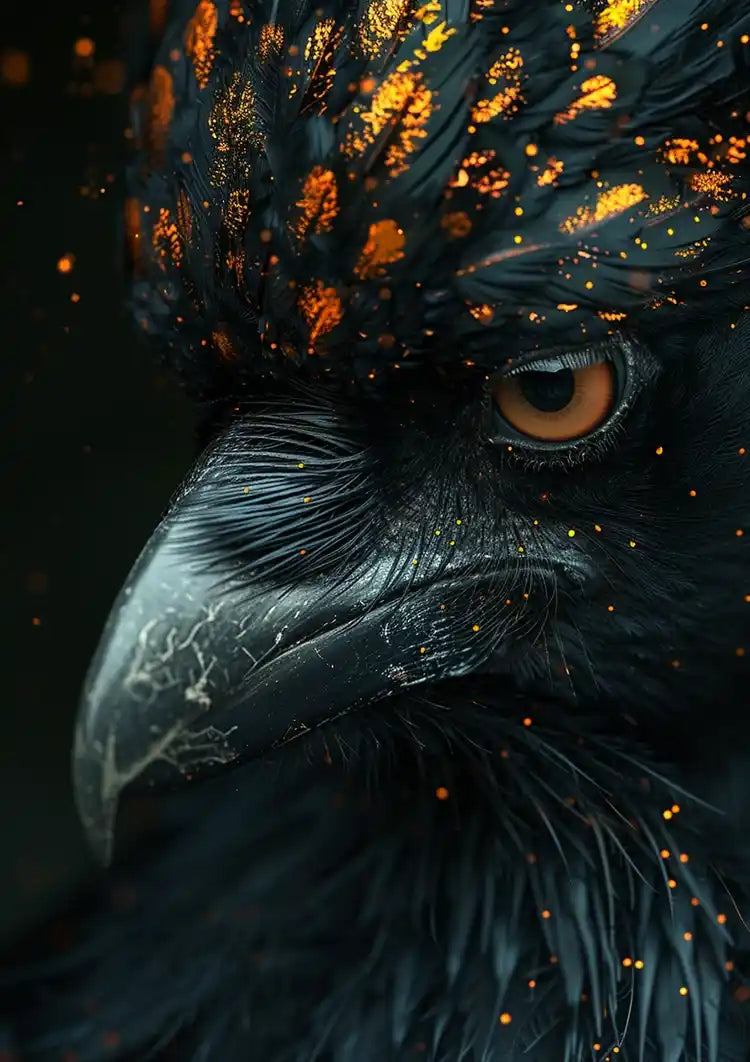 Dette maleri viser et nærbillede af en fugl med mørke fjer og markante orange pletter, især på hovedet. Dens skarpe næb og intense, gennemtrængende øjne med en fremtrædende pupil står smukt frem mod en sløret, mørk baggrund.