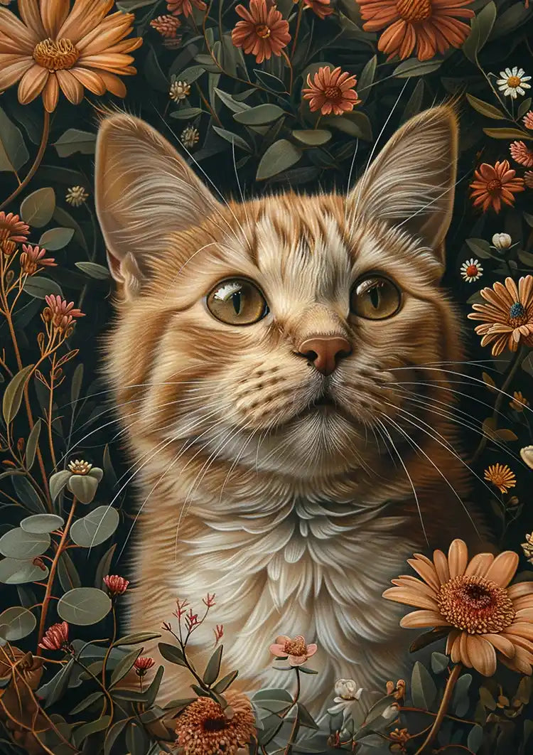 Dette maleri forestiller en vågen orange kat med slående grønne øjne, omgivet af blomster i nuancer af orange og gul. Kattens detaljerede pels, med dens lyse og mørke detaljer, står i smuk kontrast til den mørke, blomstrede baggrund.