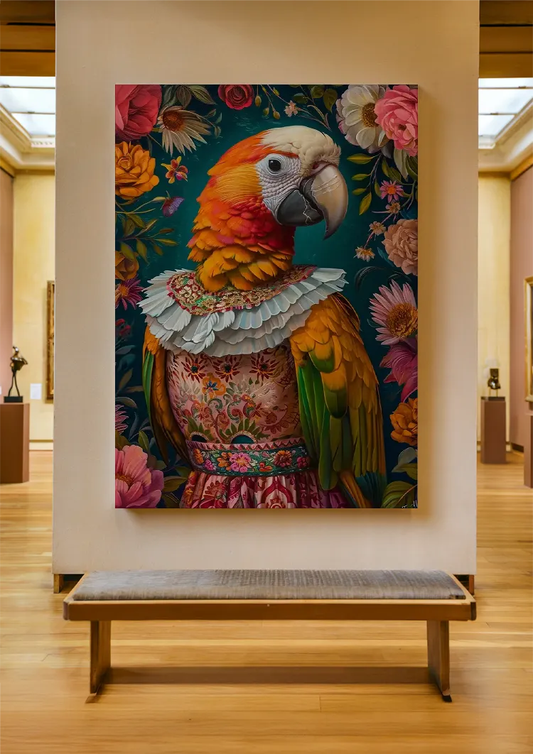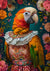 Dette maleri forestiller en livlig papegøje, klædt i et detaljeret, farverigt outfit, omgivet af indviklede blomster. Den har varme nuancer af orange, gul og grøn, og dens tøj er udsmykket med detaljerede mønstre og en flæset krave.