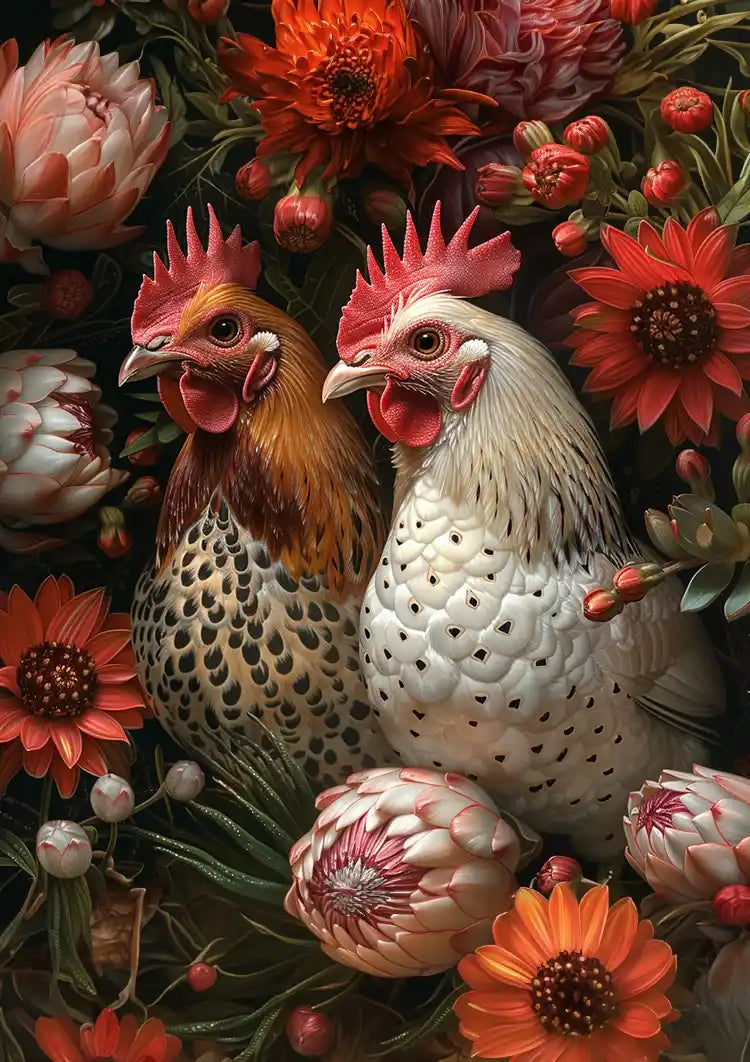 På dette maleri ser man to kyllinger stå side om side blandt farverige blomster, herunder orange og hvide. Den ene kylling har en plettet krop, den anden er hvid med sorte aftegninger, og begge har røde kamme og hagelapper.
