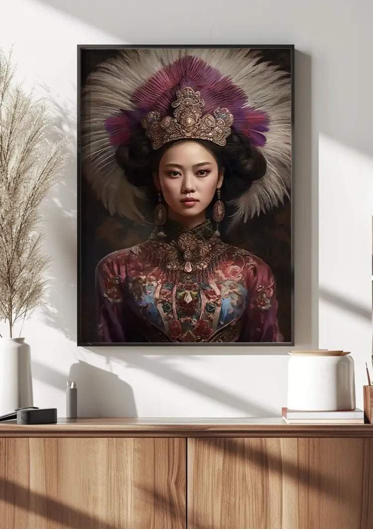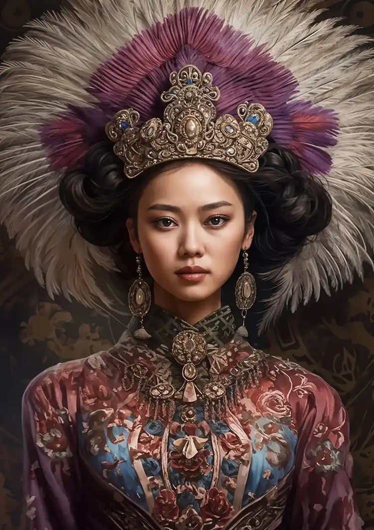 Dette maleri forestiller en person iført en udsmykket hovedbeklædning med store fjer og indviklede smykker, klædt i et kunstfærdigt dekoreret klædningsstykke med detaljerede mønstre og tilbehør, der giver et kongeligt og traditionelt udseende.