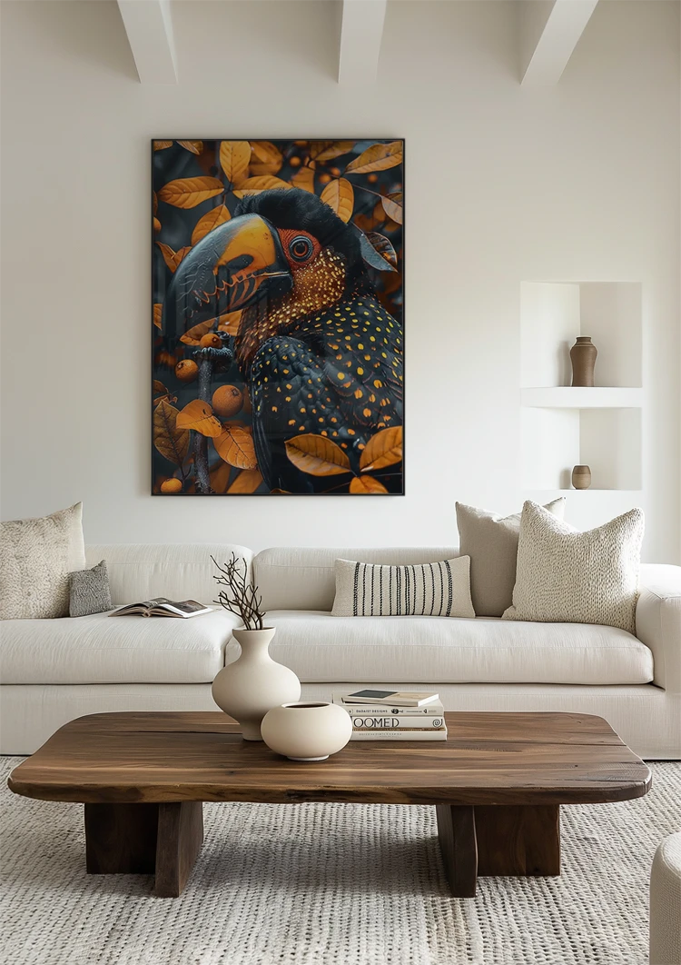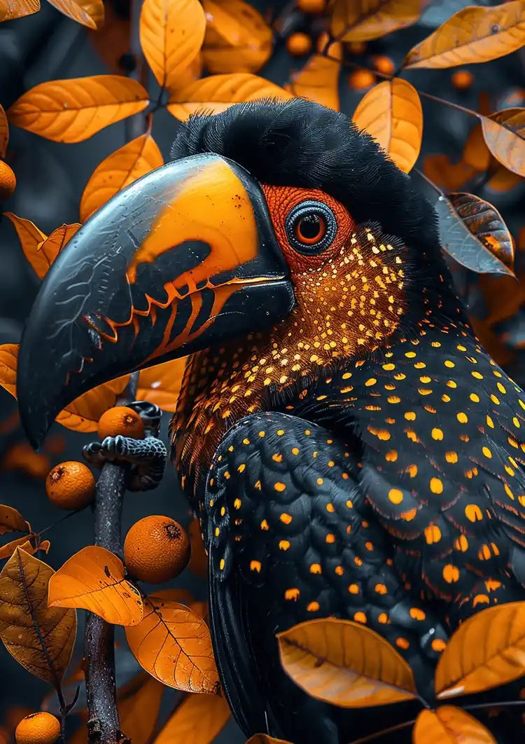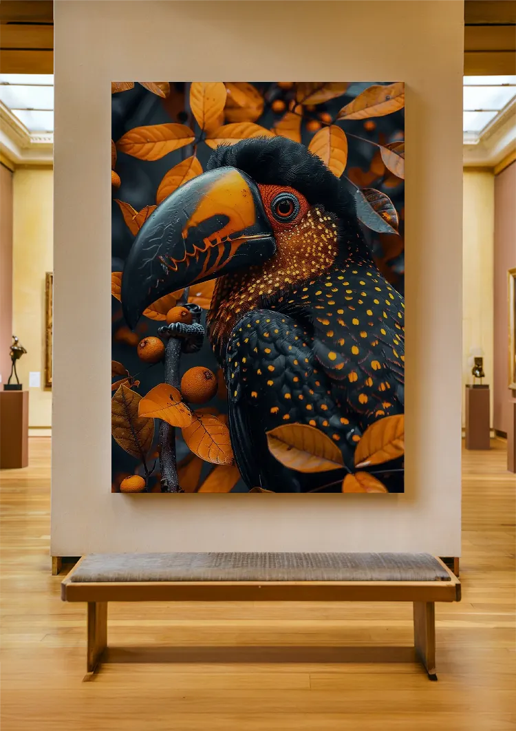 Dette maleri forestiller en smuk fugl med livlige orange og sorte fjer, der sidder højt blandt orange blade og frugter. Med sit store, buede næb og detaljerede prikkede mønstre på fjerene udstråler fuglen styrke og skønhed.