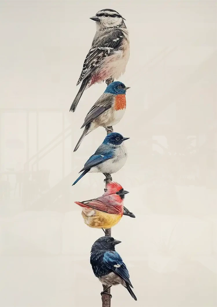 Dette maleri forestiller seks forskellige fugle, der sidder på en gren mod en almindelig hvid baggrund. Hver fugl har en unik og farverig fjerdragt, der spænder fra jordfarver til livlige røde, blå og gule farver.