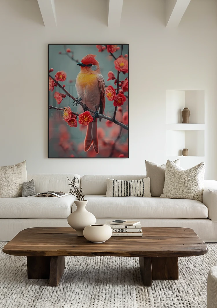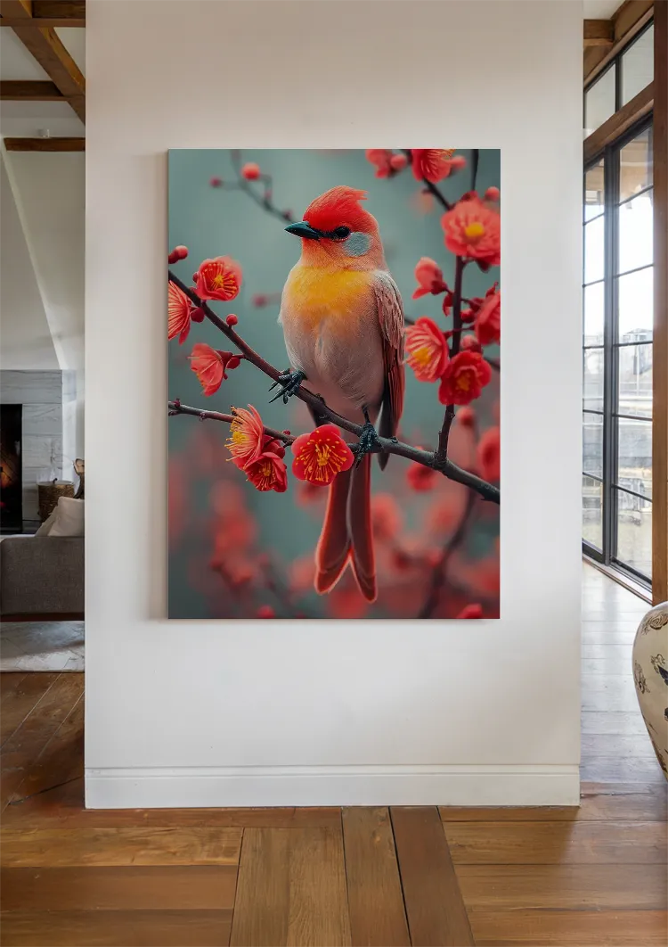 Dette maleri forestiller en livlig fugl med en lys rød kam, gult bryst og mørke halefjer, der hviler på en gren omgivet af røde blomster. Den blødt slørede baggrund fremhæver smukt fuglen og de detaljerede blomster.