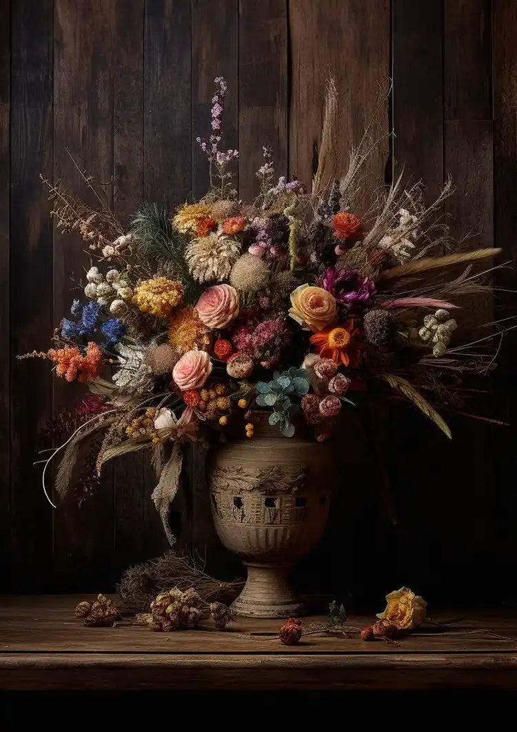Dette maleri viser et overdådigt arrangement af tørrede blomster i pink, rød, gul, blå og lilla mod en mørk træbaggrund. Et par tørrede blomster og blade er spredt ved bunden af vasen.