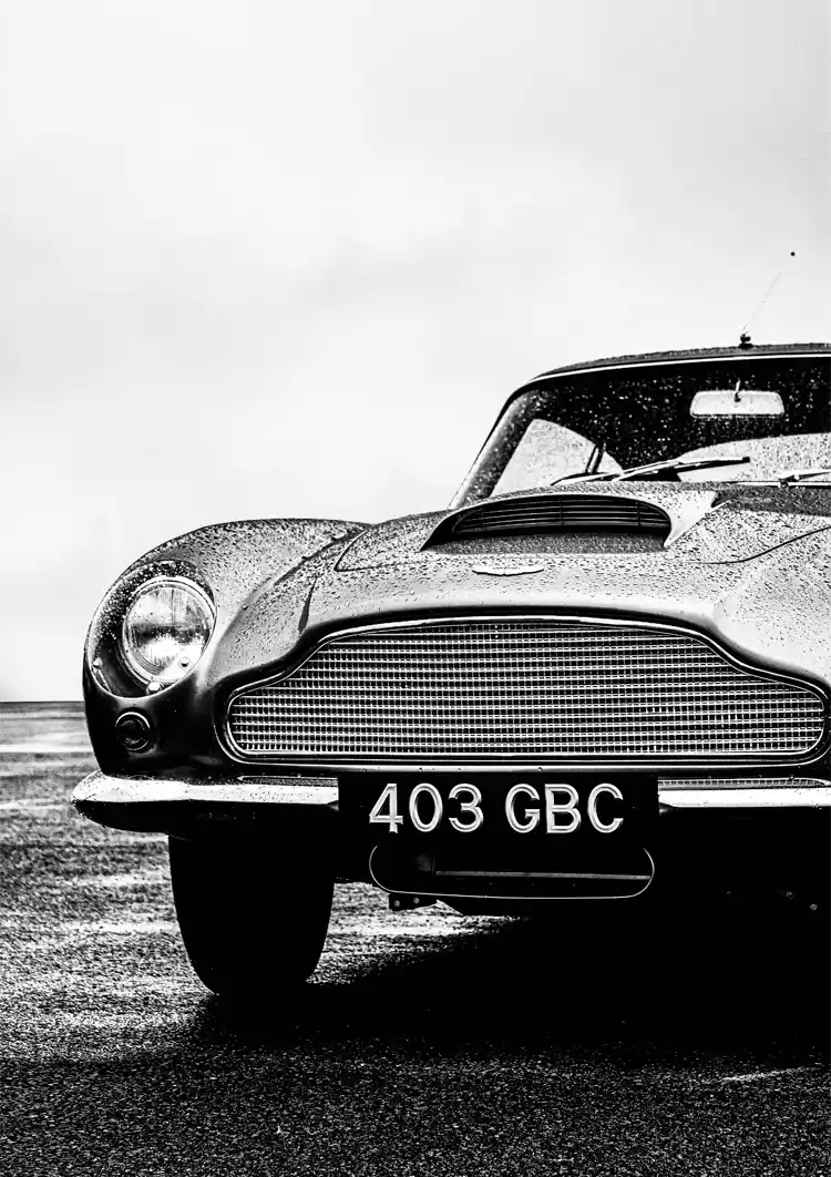 Dette maleri forestiller et sort-hvidt fotografi af en smuk Aston Martin, gennemblødt af regn, parkeret på en grå, overskyet dag. Fokus er på bilens højre forende, hvilket fremhæver dens elegante design.