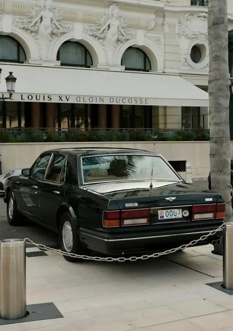 En klassisk mørkegrøn Bentley parkeret uden for den elegante Louis XV-restaurant Alain Ducasse, med facaden synlig i baggrunden og bilen lænket til en stolpe bagi.