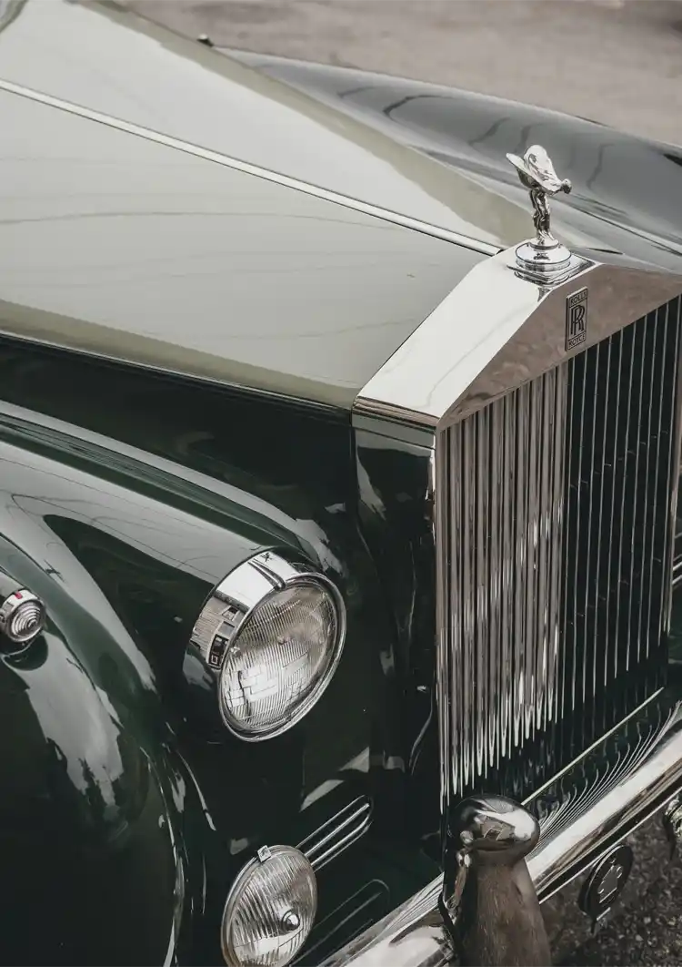 Nærbillede af fronten af en vintage Rolls-Royce med den ikoniske kølergrill og det berømte "Spirit of Ecstasy"-emblem, med vægt på det grønne karrosseri og kromdetaljer.