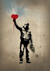 Dette maleri har et graffitikunstværk i stencil-stil med en hætteklædt figur, der holder en ballon i den ene hånd.