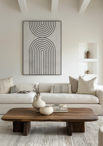 Sort-hvid kunst fungerer smukt i minimalistiske rum som et stærkt visuelt fokuspunkt. Det skaber et rent og elegant look, der udstråler ro og enkelhed. De monokromatiske farver komplementerer perfekt en minimalistisk æstetik og tilføjer et element af sofistikering uden at overvælde rummet.