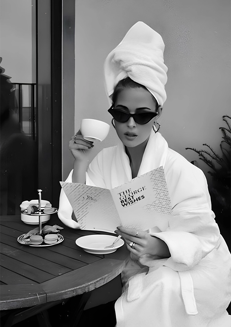 Dette maleri viser en elegant dame på en balkon, siddende på en stol i sin badekåbe, drikkende en kop kaffe og læsende menuen.