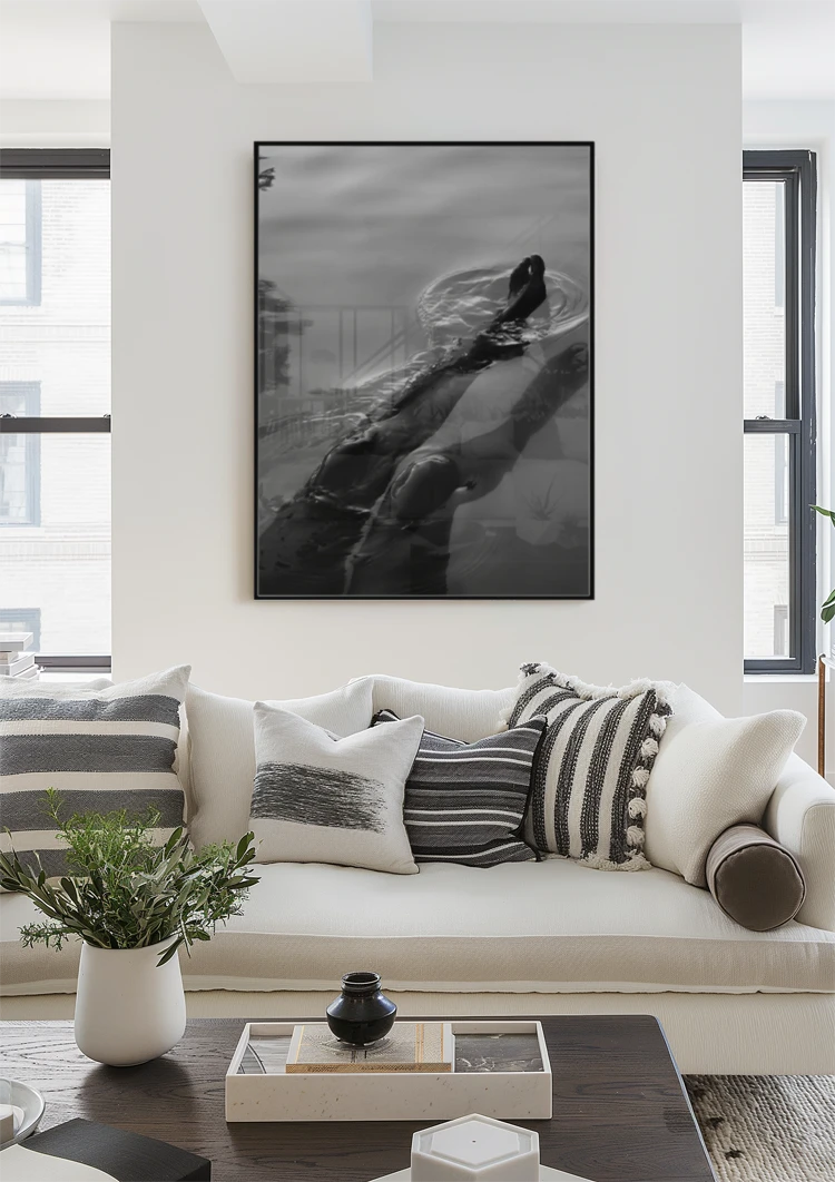 En svævende ramme giver dit kunstværk ekstra dybde og et elegant, svævende udseende. Kunstværket hænger frit fra væggen, hvilket skaber en stilfuld skyggeeffekt og får det til at skille sig ud i dit interiør.