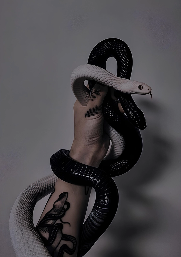 Et unikt maleri, der viser en arm omkranset af en sort-hvid slange. Der er også en tatovering af en slange på armen.