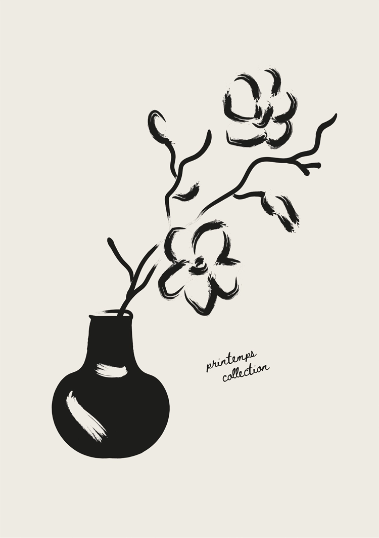Dette minimalistiske sort-hvide maleri indfanger den enkle elegance af en rund vase med tre smukke blomstrende blomster. Et tidløst værk, der udstråler ro og naturlig skønhed.