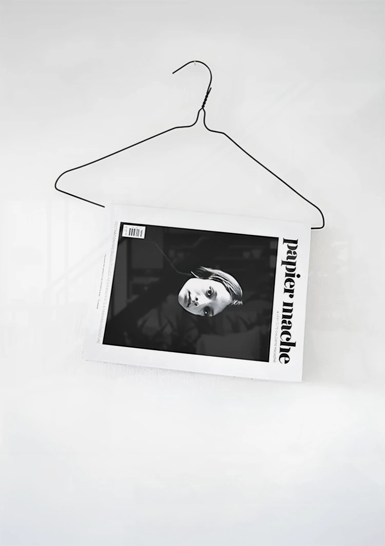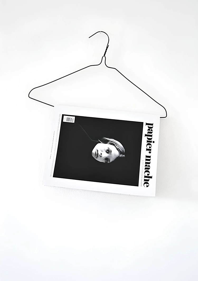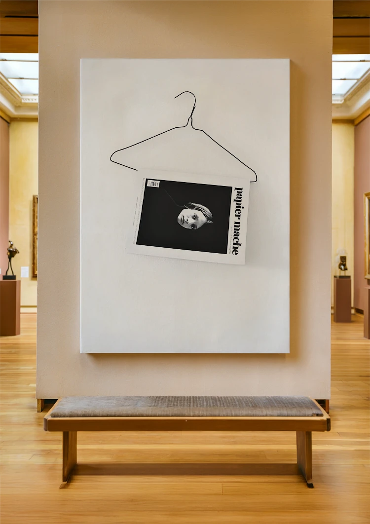 Sort-hvidt maleri af en sort bøjle med et magasin på, hvorpå der står "paper maché".