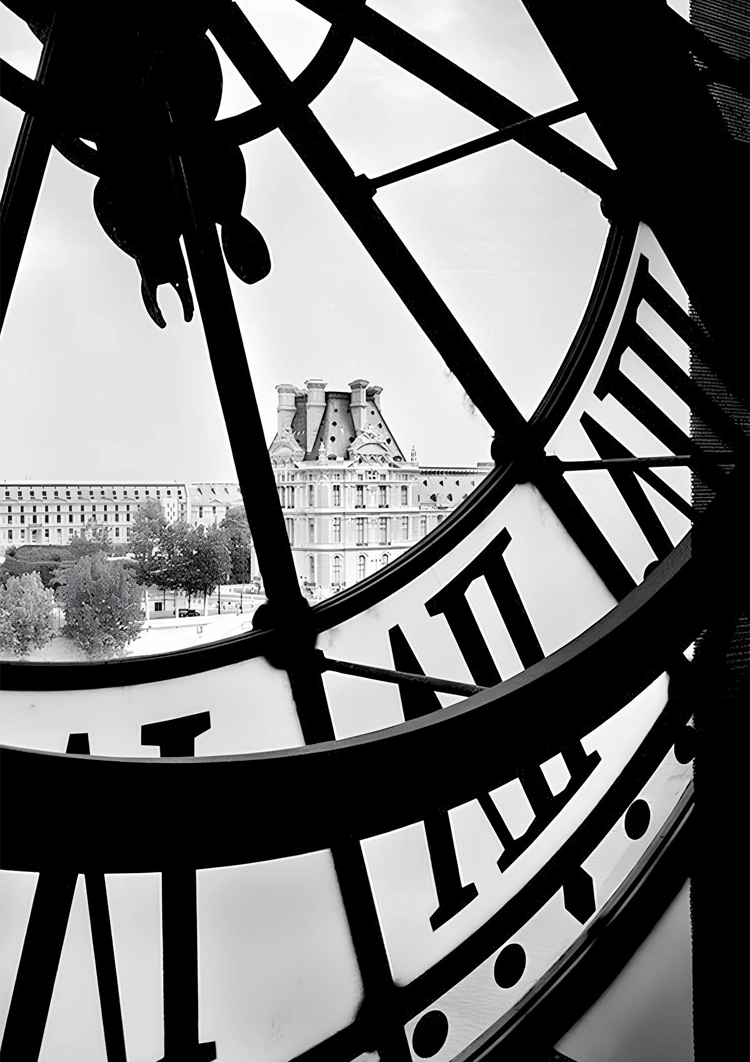 Et sort-hvidt maleri med udsigt over bygninger gennem en åbning i en urskive.