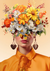 Dette smukke maleri forestiller en orange blomsterkvinde med en stor buket farverige blomster, der harmonerer perfekt med den smukke orange baggrund, hvor hendes skønhed virkelig kommer til udtryk.