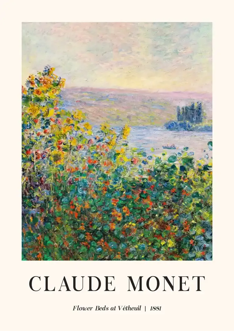 Dette maleri fra 1881 af Claude Monet, "Blomsterbede ved Vétheuil", forener farverige blomsterbede, en flod og en lille bygning i impressionistisk stil.