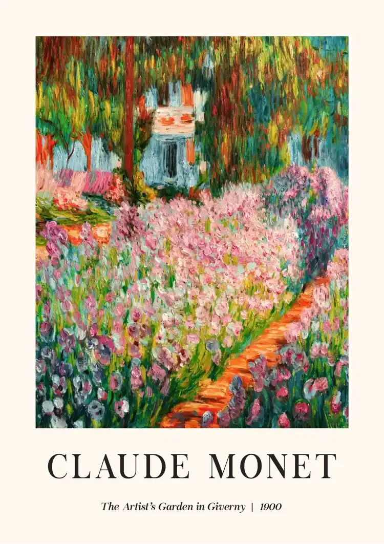 Dette maleri er en reproduktion af Claude Monets maleri "Kunstnerens have i Giverny" fra 1900. Kunstværket skildrer en frodig, levende have fyldt med en række farverige blomster, en sti og grønne områder, med en bygning delvist synlig i baggrunden.