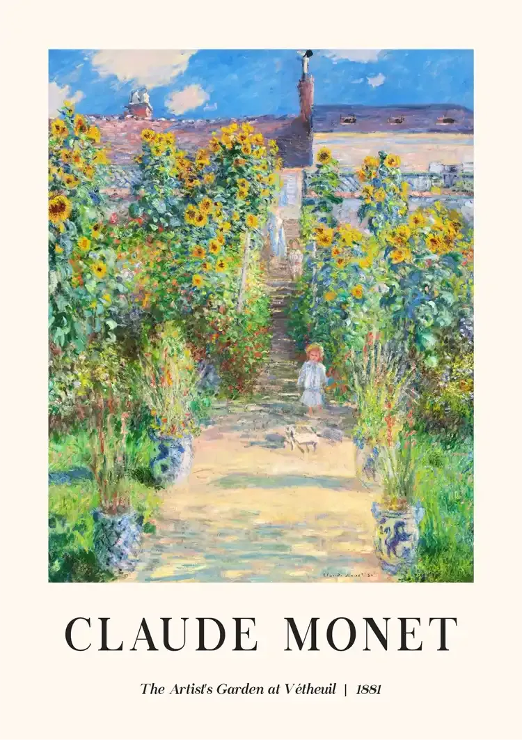 I dette maleri fra 1881 af Claude Monet, "Kunstnerens have i Vétheuil", indfanger han en fredfyldt have fuld af solsikker med en sti, der fører til et hus, som en kvinde og et barn nærmer sig.