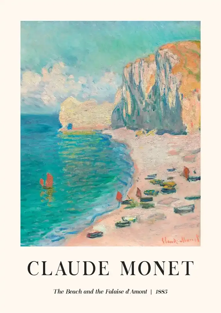 Dette maleri fra 1885 af Claude Monet, "Stranden og Falaise d'Amont", indfanger et fredfyldt kystscene med klipper, et roligt hav og både under en skydækket himmel. Kompositionen er indrammet i bunden af en lys baggrund med ledsagende tekst.