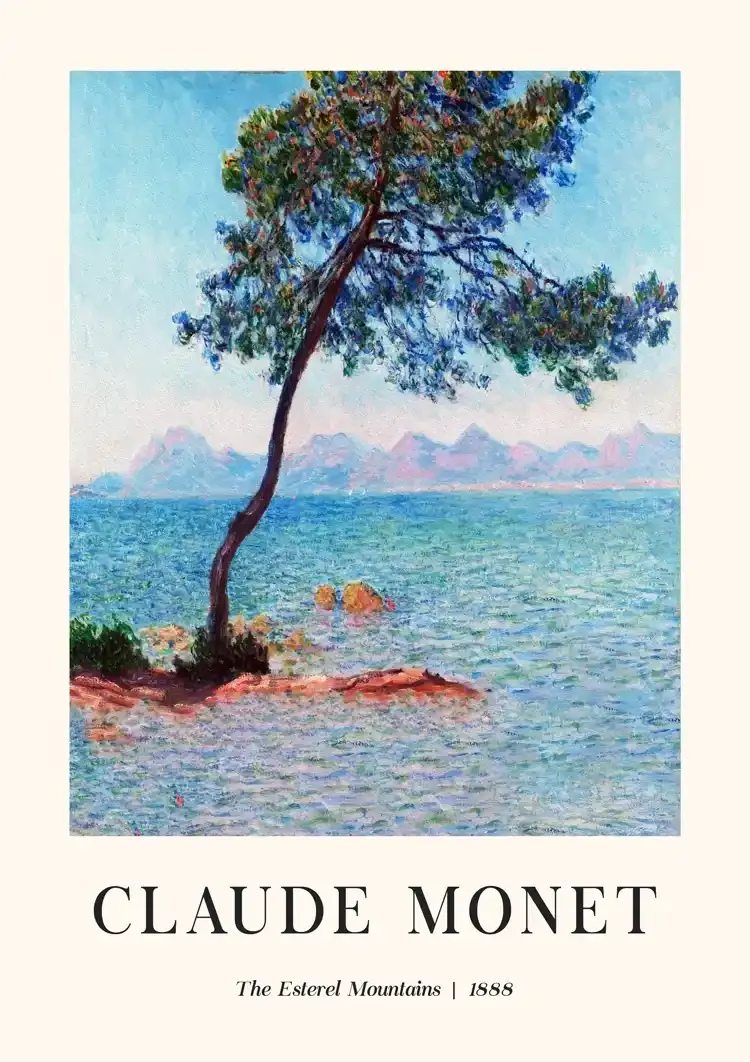 Dette maleri fra 1888, "Esterelbjergene" af Claude Monet, viser et ensomt træ på en lille grund ved vandet med imponerende bjerge i baggrunden.