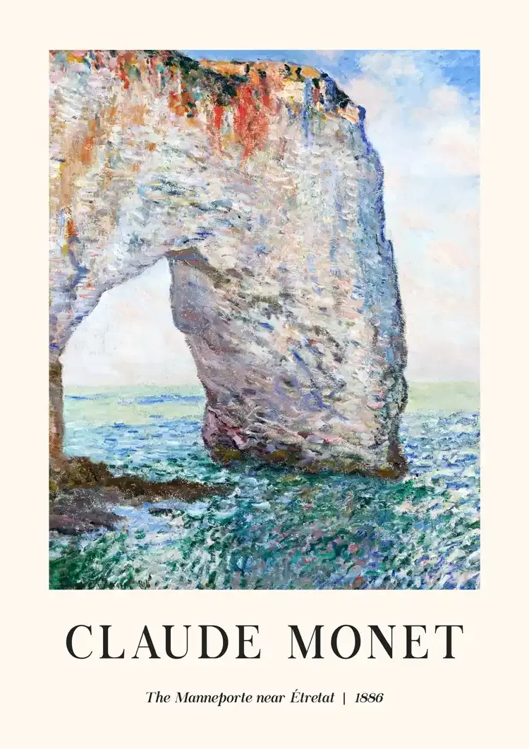 I dette maleri fra 1886 af Claude Monet, "Manneporte nær Étretat", ser man en imponerende naturlig klippebue ved havet, plaget af bølger, alt sammen i Monets karakteristiske impressionistiske stil.