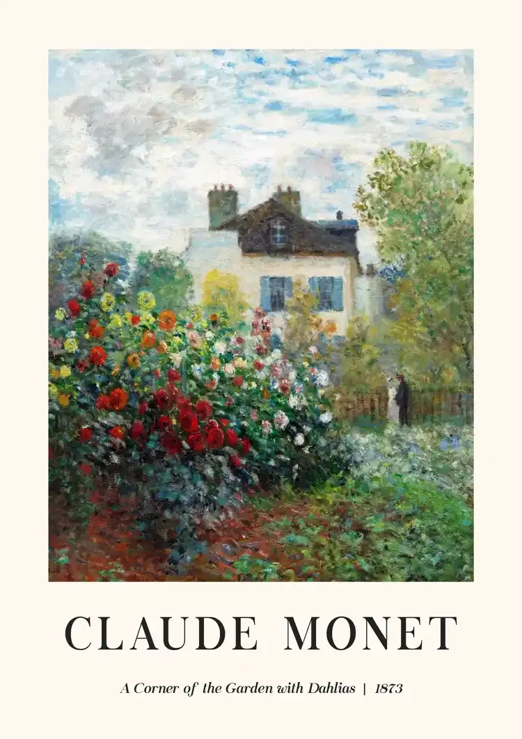 Dette maleri af Claude Monet med titlen "Et hjørne af haven med georginer" indfanger pragten i en have i blomst med livlige røde og hvide blomster mod en hyggelig baggrund.