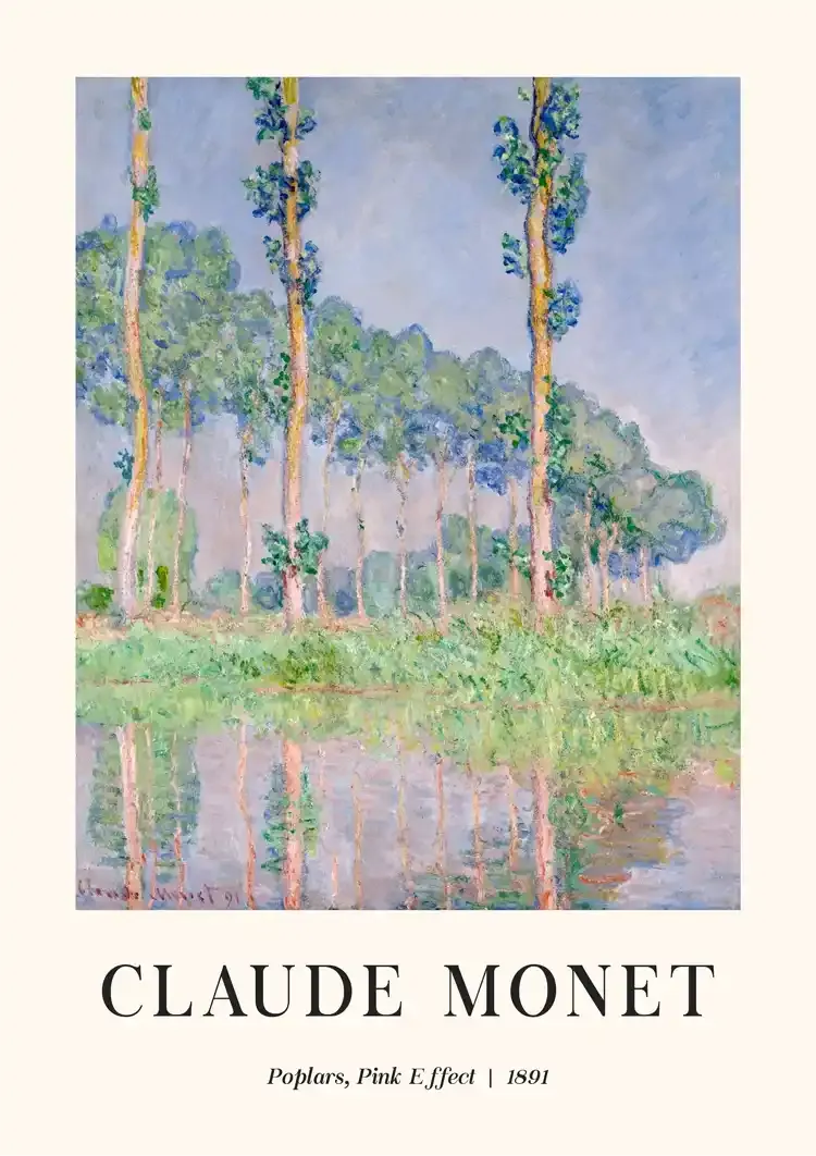 I dette maleri fra 1891, "Poplar, lyserød effekt", spejler høje popler sig i en fredfyldt vandmasse under en pastelrosa himmel, en blanding af levende farver og impressionistiske teknikker.