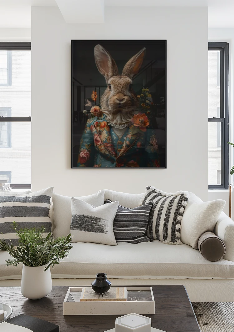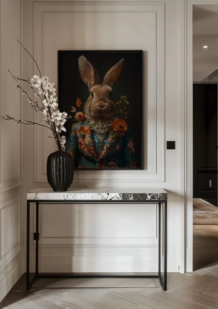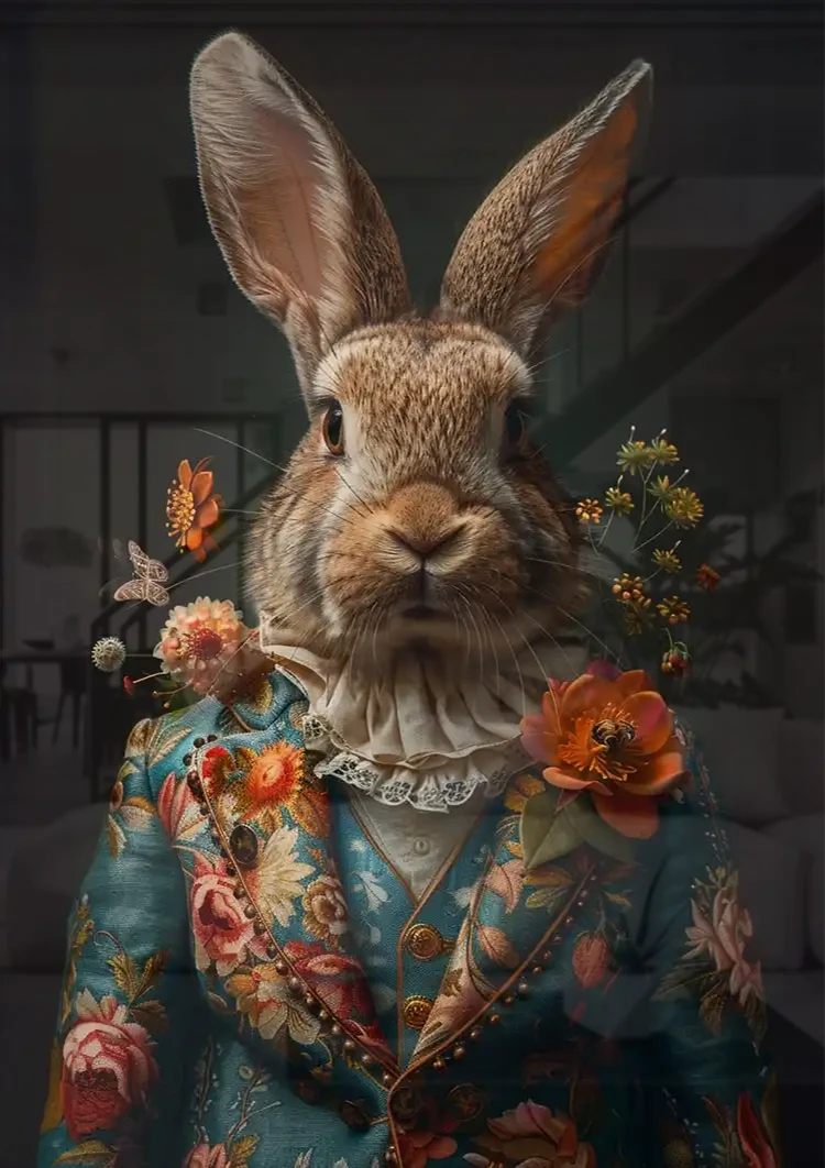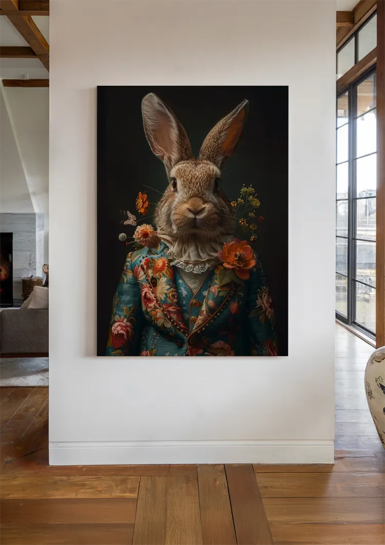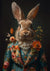 Dette maleri forestiller en kanin i portrætstil, klædt i et charmerende jakkesæt med blomstermotiver og en delikat flæsekrave. Den mørke baggrund har blomsterdetaljer, der fremhæver jakkesættets design og tilføjer et legende og kunstnerisk præg.
