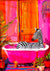 En zebra i et lyserødt badekar i et farvestrålende rum, legesyg og urealistisk som en drøm.