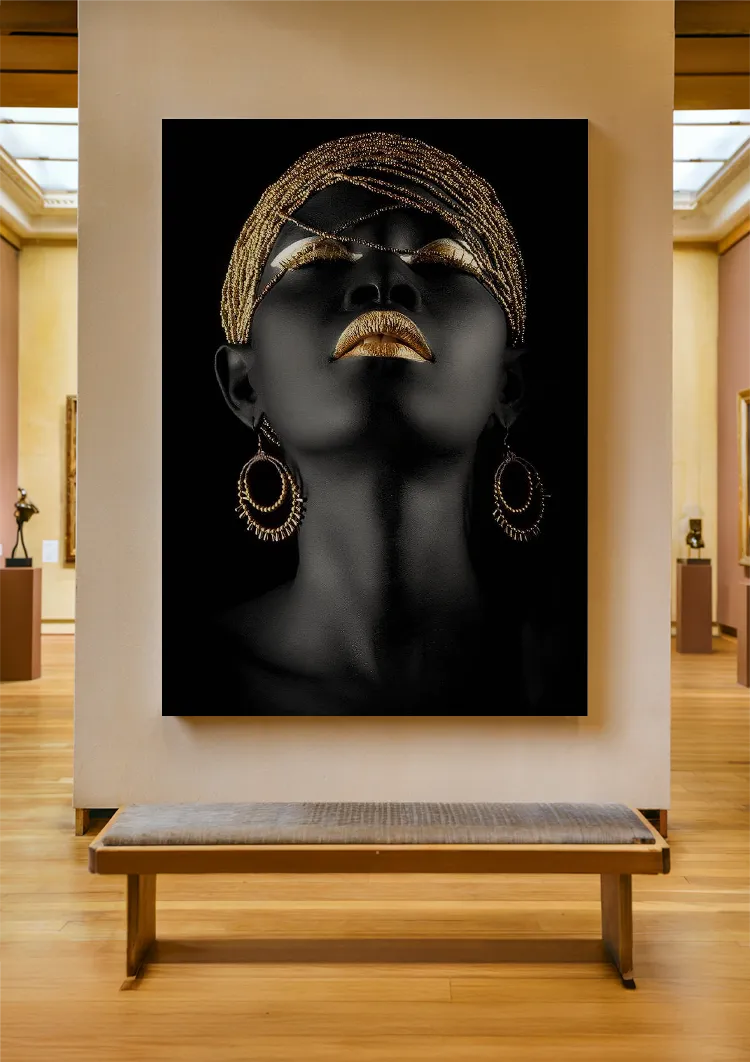 Et portræt af en person med skinnende gyldne læber, gyldne øjenbryn og et gyldent pandebånd mod en sort baggrund.